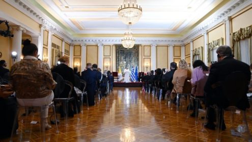 Buổi gặp gỡ bắt đầu với diễn văn chào mừng của Tổng thống Hy Lạp, trong đó Tổng thống Katerina đã đề cập đến những vấn đề mà Đức Thánh Cha ưu tiên và Hy Lạp cũng quan tâm, bao gồm đối thoại liên tôn và tính phổ quá của Kitô giáo, khủng hoảng di cư và tị nạn, đói nghèo, biến đổi khí hậu và đại dịch. Tổng thống cũng tái khẳng định việc Hy Lạp mong muốn được hợp tác với Tòa thánh để bảo vệ cộng đồng Kitô hữu tại những khu vực có nguy cơ bị bách hại và phân biệt đối xử.