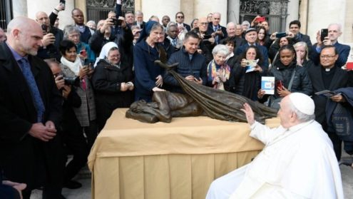 Trước khi bắt đầu buổi tiếp kiến chung sáng thứ Tư 9/11/2022, Đức Thánh Cha đã làm phép và công bố tác phẩm điêu khắc mới về người vô gia cư, có tên “Sheltering”, tại Quảng trường Thánh Phêrô, nhằm nêu bật hoàn cảnh khó khăn của những người vô gia cư.