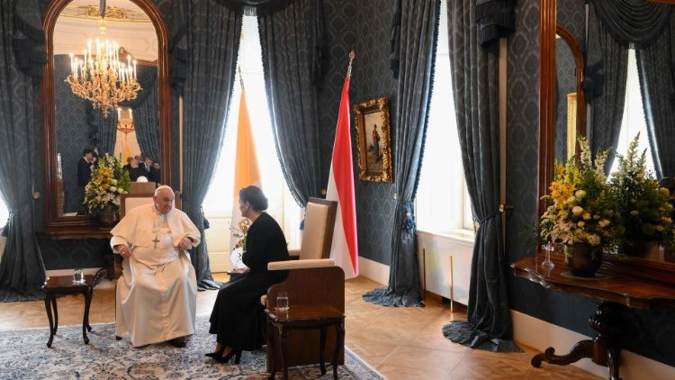 Sau lễ nghi đón tiếp chính thức, Đức Thánh Cha và Tổng thống Hungary đi lên lầu một của phủ Tổng thống để hội kiến riêng.