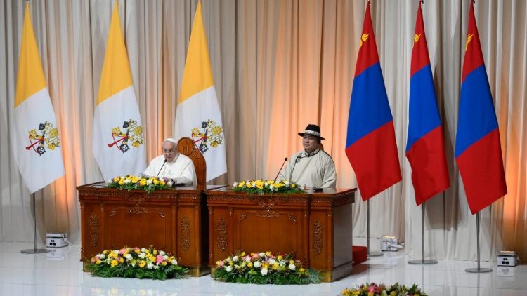 Vatican News (02.09.2023) – Phát biểu trước các cấp chính quyền, xã hội dân sự và ngoại giao đoàn ở Mông Cổ vào sáng thứ Bảy 02.09.2023, Đức Thánh Cha đề cao vai trò của Mông Cổ đối với hòa bình thế giới, khen ngợi sự chung sống hòa hợp giữa các nền văn hóa và tôn giáo ở Mông Cổ. Đặc biệt, ngài nhấn mạnh rằng Giáo hội Công giáo muốn đóng góp cho công ích, giúp phát triển con người toàn diện qua các hoạt động giáo dục và bác ái và xây dựng một cuộc sống an ninh thịnh vượng cho đất nước Mông Cổ.