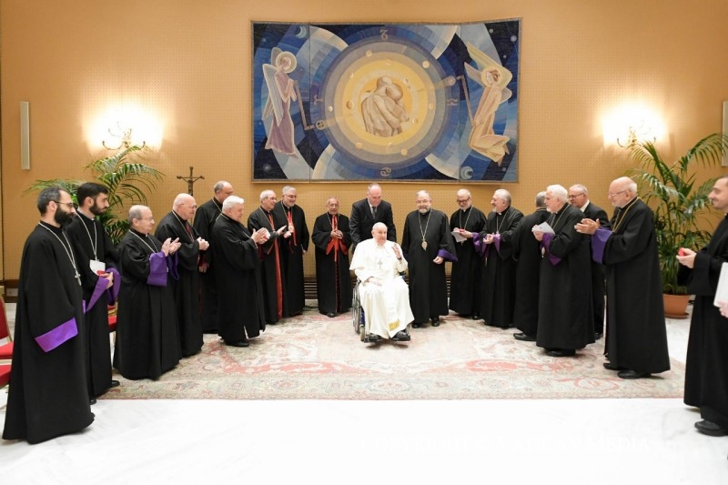 Thưa Đức Thượng phụ, các anh em thân mến, làm sao cuối cùng chúng ta lại không hướng suy tư của mình đến đất nước Armenia, không chỉ bằng lời nói mà trên hết là bằng lời cầu nguyện, nhất là cho tất cả những người đang chạy trốn khỏi Nagorno-Karabakh, và vô số gia đình phải di tản đang tìm nơi ẩn náu. Có quá nhiều loạn lạc và biết bao đau khổ! Chiến tranh Thế giới thứ Nhất được cho là cuộc chiến cuối cùng, khi nó dẫn đến việc các quốc gia thành lập Hội Quốc Liên, “tiền thân” của Liên Hiệp Quốc, với sự tin tưởng rằng điều này sẽ đủ để bảo tồn món quà hòa bình. Vậy mà từ đó đến nay, chúng ta đã chứng kiến biết bao cuộc xung đột và thảm sát, luôn bi thảm và luôn vô nghĩa. Tôi thường xuyên van nài: “Đủ rồi!” Tất cả chúng ta hãy cất lên tiếng kêu vì hòa bình, để tiếng kêu này có thể chạm đến những tâm hồn, ngay cả những tâm hồn vô cảm trước những đau khổ của người nghèo và người thấp hèn. Và trên hết, chúng ta hãy cầu nguyện. Tôi cầu nguyện cho anh em và cho đất nước Armenia; và xin anh em cũng cầu nguyện cho tôi!