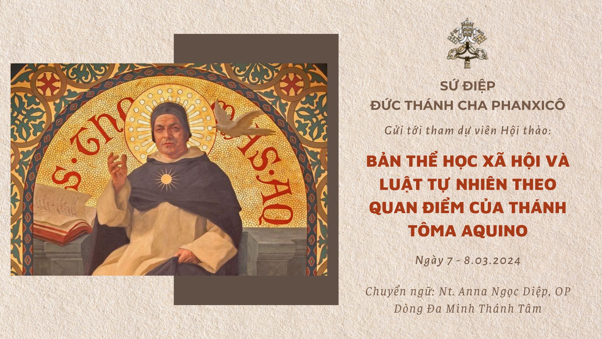 WHĐ (10.03.2024) – Để tôn vinh di sản của Thánh Tôma Aquino sau 750 năm ngày ngài qua đời, Hàn lâm viện Tòa Thánh về Khoa học Xã hội đã tài trợ tổ chức cuộc Hội thảo về chủ đề “Bản thể học xã hội và Luật tự nhiên theo quan điểm của Thánh Tôma Aquino. Tầm nhìn về và từ Khoa học xã hội” tại Roma trong 2 ngày 07-08. 03. 2024. Nhân dịp này, Đức giáo hoàng Phanxicô đã gửi tới các tham dự viên Hội thảo một Sứ điệp. Sau đây là toàn văn Việt ngữ Sứ điệp của Đức Thánh Cha: