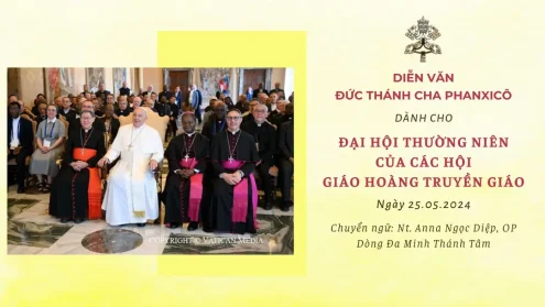 WHĐ (27.05.2024) – Sáng ngày 25.05, Đức Thánh Cha đã dành cho các tham dự viên Đại hội của các Hội Giáo hoàng truyền giáo buổi tiếp kiến riêng. Đại hội thường niên do Phân bộ Loan báo Tin mừng tổ chức từ ngày 24-31.05.2024 tại Sacrofano, gần Rôma, quy tụ các đại biểu từ hơn 120 quốc gia trên khắp 5 Châu lục. Sau đây là toàn văn Việt ngữ bài Diễn văn của Đức Thánh Cha: