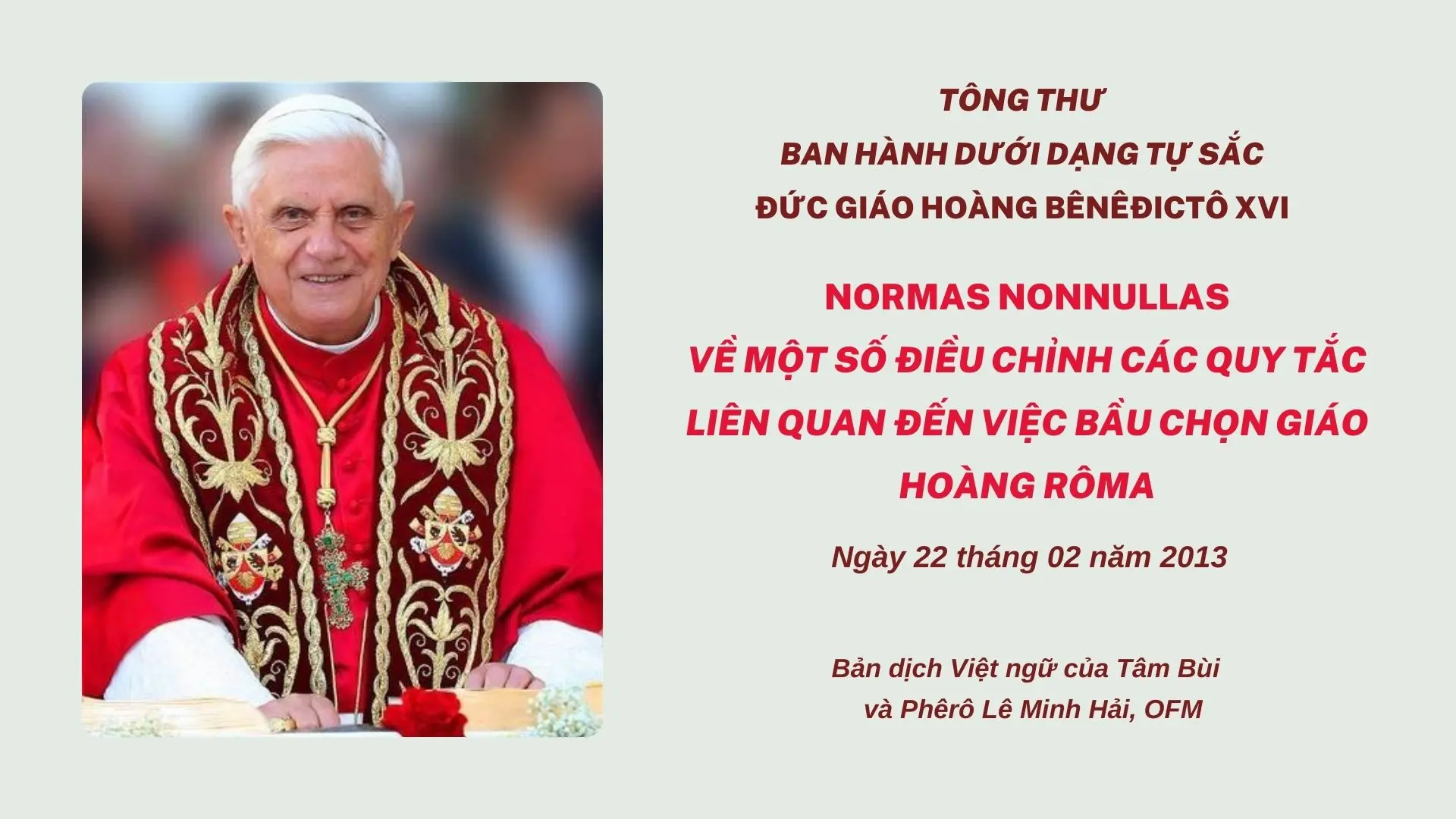 Ban hành tại Rôma, tại Đền thờ Thánh Phêrô, ngày 22 tháng 02 năm 2013, năm thứ tám triều Giáo hoàng của tôi.