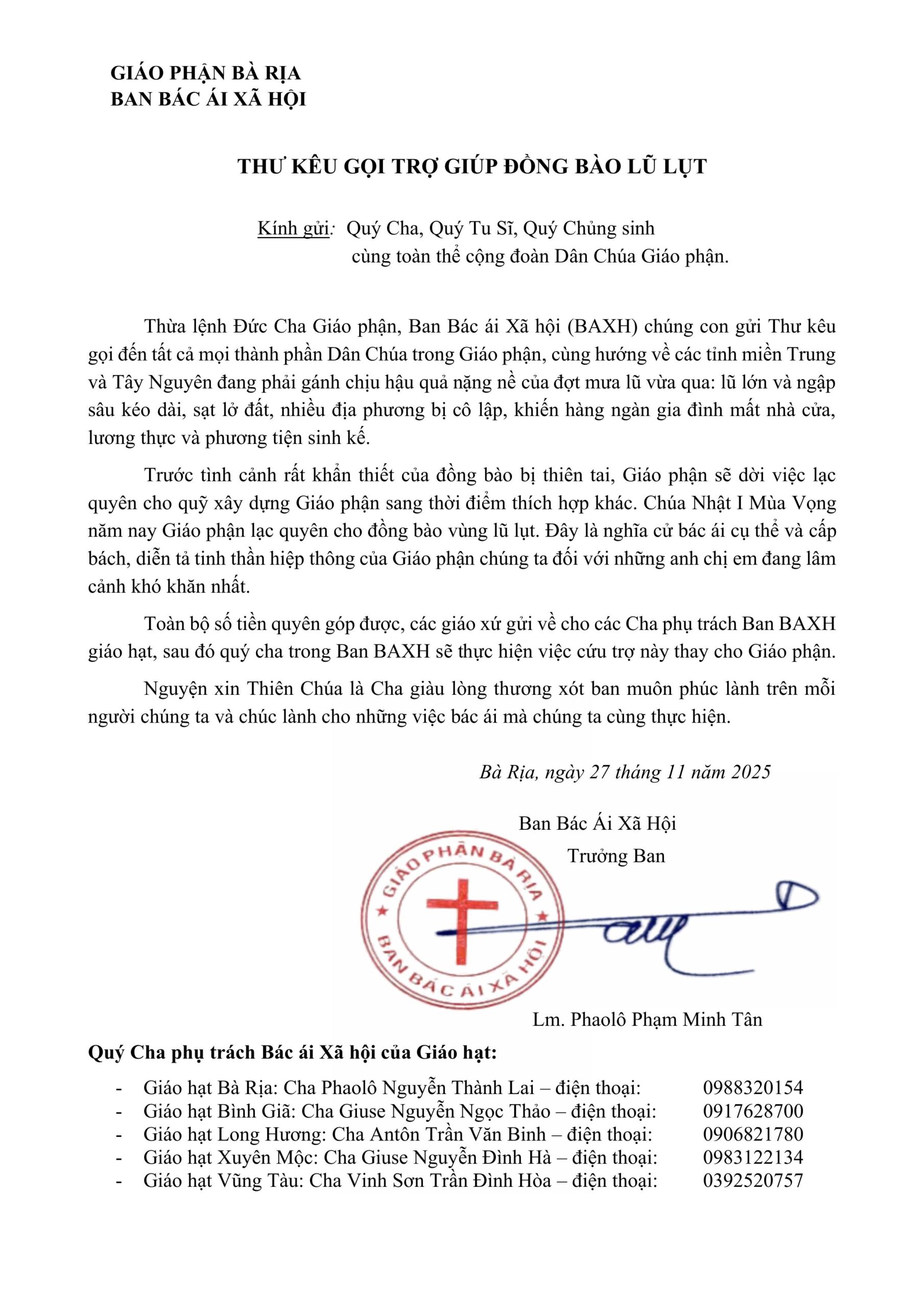 GIÁO PHẬN BÀ RỊA: THƯ KÊU GỌI TRỢ GIÚP ĐỒNG BÀO LŨ LỤT