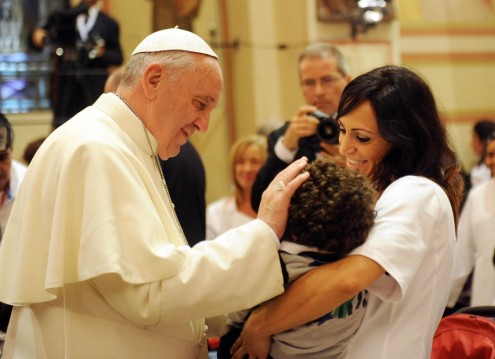 Papa Francesco accarezza un bambino durante la visita ad Assisi, 4 ottobre 2013. ANSA/ CROCCHIONI