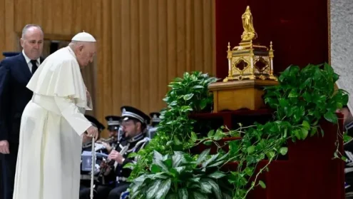 “Tôi chào các tín hữu đi cùng thánh tích của Thánh Têrêsa Hài Đồng Giêsu”, Đức Thánh Cha Phanxicô nói trong buổi tiếp kiến hôm Thứ Tư tuần này. Việc Đức Thánh Cha chiêm niệm trước thánh tích là giây phút được chờ đợi bởi những người hành hương đến từ Lisieux này.