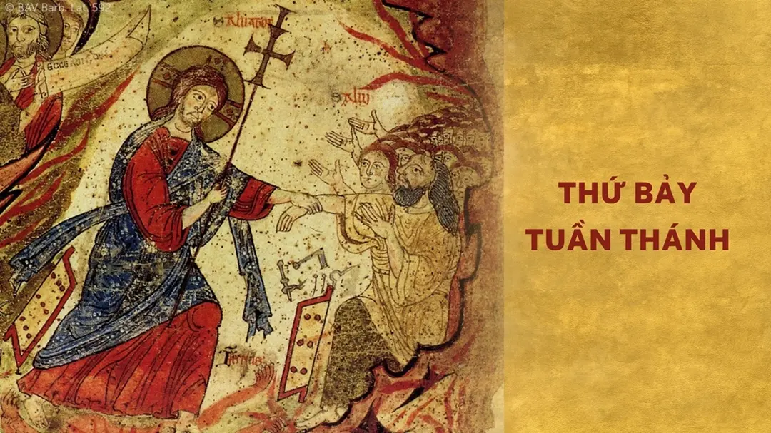“Hôm nay cõi đất chìm trong thinh lặng. Thinh lặng như tờ và hoàn toàn thanh vắng. Thinh lặng như tờ vì Đức Vua đang yên giấc. Cõi đất kinh hãi lặng yên vì Thiên Chúa đã ngủ say trong xác phàm. Người muốn tới viếng thăm những ai ngồi nơi tăm tối và trong bóng tử thần. Thật vậy, trước hết Người đi tìm nguyên tổ như tìm con chiên lạc… Người cầm lấy tay, lay ông dậy và nói: Tỉnh giấc đi, hỡi người còn đang ngủ! Từ chốn tử vong, trỗi dậy đi nào! Đức Kitô sẽ chiếu sáng ngươi.” (Trích một bài giảng cổ về ngày Thứ Bảy Tuần thánh, trong giờ kinh Sách, Thứ Bảy Tuần thánh)