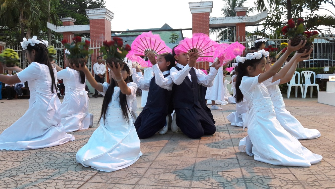 Với những điệu múa nhịp nhàng vui tươi, với năm sắc hoa trắng đỏ xanh vàng tím trên tay, đội ngũ các em Thiếu nhi hân hoan tiến dâng lên Mẹ muôn hoa tươi thắm, tượng trưng cho những đóa hoa thiêng cộng đoàn Giáo xứ Thủ Lựu hiệp dâng kính Mẹ. Đó là tâm tình biết ơn yêu mến, đó là tấm lòng cậy tin phó thác vào Chúa. Trong đó chứa đựng bao hy sinh vất vả của người cha, những lo toan nhẫn nhục của người mẹ, và sự chăm ngoan vâng lời của người con trong các gia đình. Giờ đây, trước ngai tòa Mẹ chìm ngập trong ánh nến lung linh, giữa muôn hoa sắc thắm và hương trầm ngào ngát, muôn tấm lòng con cái đều hướng về Mẹ, xin Mẹ cầu bầu cùng Chúa cho tất cả chúng con, mỗi ngày biết yêu mến Chúa nhiều hơn, mỗi ngày một sống tốt hơn, đạo đức hơn, để xứ đạo Thủ Lựu chúng con trở nên cộng đoàn hiệp nhất, yêu thương hơn.