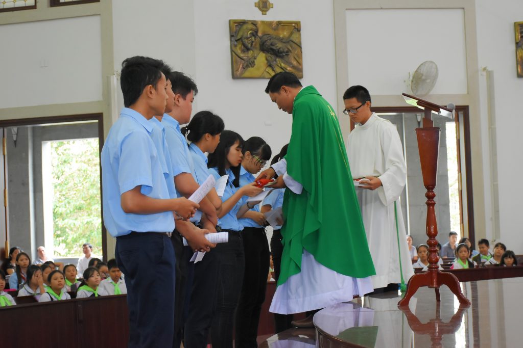 Sau nghi thức tuyên hứa, Cha đã trao chứng thư và khăn quàng cho các giáo lý viên mới để chứng nhận tư cách và sự dấn thân của họ làm người giảng dạy Giáo lý trong Hội Thánh Công giáo và cũng là cách để họ luôn tự nhắc nhớ mình là người sống và thông truyền Giáo lý của Chúa, quyết tâm hoàn thành nhiệm vụ.