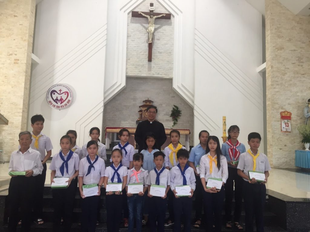 Sau thánh lễ thiếu nhi, Cha Giuse Đỗ Đức Hiện- Chánh xứ Tân Phước, Quý Dì phụ trách, Ban Hành Giáo (BHG) và Giáo lý viên (GLV) đã trao 48 phần quà Khuyến học cho các em trong giáo xứ. Đây là những em có gia cảnh khó khăn nhưng học tập xếp loại giỏi (giáo lý và văn hóa). Những phần quà tuy nhỏ bé này nhưng cũng sẽ giúp gia đình các em phần nào bớt lo toan chuẩn bị cho năm học mới, là nguồn động lực thúc đẩy các em bước vào năm học mới với quyết tâm sẽ ngoan ngoãn hơn, siêng năng học giáo lý, cố gắng học hành giỏi giang ở nhà trường.