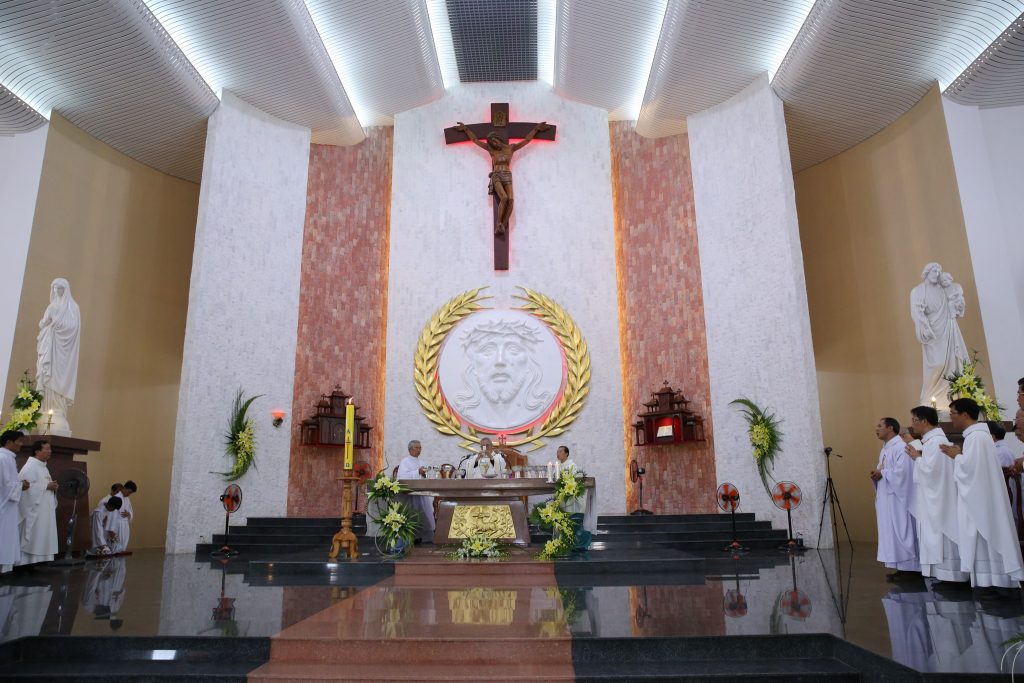 Tiếp đến, đoàn đồng tế cùng cộng đoàn tiến vào Nhà Chúa để hiệp dâng thánh lễ, tôn vinh và tạ ơn Thiên Chúa. Thánh lễ do Đức Cha Emmanuel chủ tế. Cùng đồng tế với Ngài có Cha Giuse Võ Công Tiến – Tổng Đại diện Giáo phận Bà Rịa, Cha Giuse Đặng Cao Trí – Quản hạt Bình Giã, quý Cha, quý Tu sĩ nam nữ, quý Ân nhân và cùng đông đảo cộng đoàn dân Chúa trong và ngoài giáo phận.