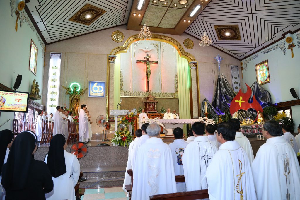 Trong tâm tình tạ ơn Thiên Chúa, lúc 9g30 sáng ngày 30.12.2017, Giáo xứ Thủy Giang, Giáo hạt Vũng Tàu đã long trọng tổ chức thánh lễ tạ ơn nhân dịp Bế mạc Năm Thánh mừng Ngọc Khánh Giáo xứ với ơn toàn xá do Đức Cha Emmanuel – Vị chủ chăn kính yêu của Giáo phận chủ sự và chia sẻ Lời Chúa. Cùng hiệp thông trong thánh lễ có Cha Giuse Võ Công Tiến – Tổng Đại diện Giáo phận, quý cha quản hạt, quý cha, quý tu sĩ nam nữ, quý chủng sinh, quý khách mời trong và ngoài giáo xứ.