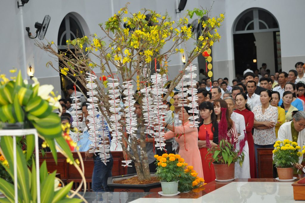 Tiếp theo phần chia sẻ Tin Mừng là nghi thức Hái lộc đầu năm. Sau khi Cha Chánh xứ làm phép Lộc Thánh, mọi người trang nghiêm xếp hàng đón nhận lời Chúa thương ban để làm kim chỉ nam cho hành trình năm mới này.