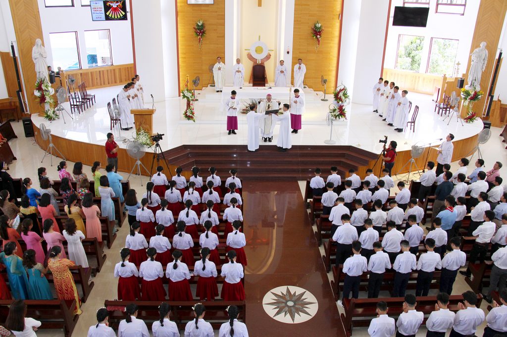 Khởi đầu thánh lễ, Đức cha mời gọi cộng đoàn cùng hiệp ý cầu nguyện cho các em sắp lãnh nhận Bí tích Thêm Sức, để qua nghi thức đặt tay và xức dầu thánh các em được đầy tràn ơn Chúa Thánh Thần.
