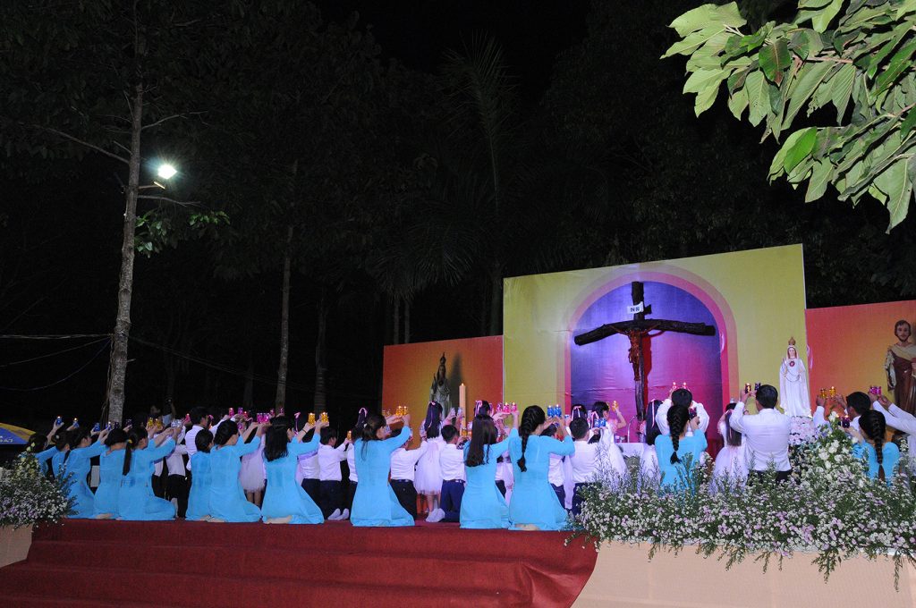 Đúng 18g00 trong bầu khí trang nghiêm sốt sắng, đông đảo cộng đoàn dân Chúa giáo họ tham dự giờ dâng hoa mừng kính Mẹ Maria. Sau khi kiệu Đức Mẹ rước đặt nơi lễ đài, đại diện các thành phần dâng Chúa trong giáo họ thành tâm dâng hoa kính Đức Mẹ. Từng đóa hoa là từng tâm hồn, từng lời nguyện ước dâng trao về Mẹ. Những điệu múa đơn sơ, giản dị nhưng đã bày tỏ hết tấm lòng của đoàn con thảo hướng về Mẹ. Đoàn con cái đang quây quần bên Mẹ, dâng lên Mẹ những niềm vui và nỗi buồn, bao ưu tư lo lắng của cuộc đời, bao khó nhọc khổ đau của kiếp người yếu đuối. Tất cả dâng về Mẹ để được Mẹ xoa dịu, ủi an và chở che con cái Mẹ vững bước vượt qua biển đời trần thế hôm nay.