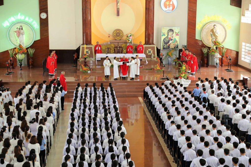Sau bài giảng là nghi thức thêm sức, Cha Giuse Trần Minh Sơn – Chánh xứ Chu Hải đã giới thiệu lên Đức Cha 251 thụ nhân trong giáo xứ đã được học giáo lý đầy đủ, được sát hạch, chứng nhận đủ điều kiện và xin Đức Cha ban Bí Tích Thêm Sức cho các em.