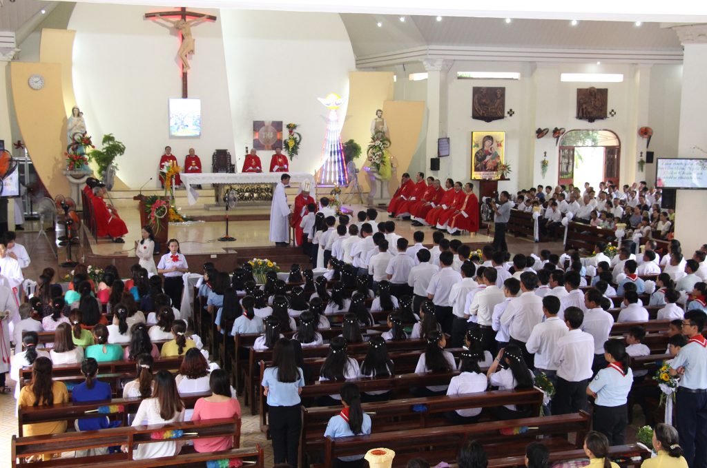 Đồng tế với Đức cha có Cha Giuse Trần Minh Sơn- Quản hạt Long Hương; Cha Giuse Đoàn Như Nghĩa- Giám đốc Chủng viện Thánh Tôma – Hải Sơn; quý cha trong Hạt Long Hương. Đông đảo quý phụ huynh cùng các thành phần dân Chúa trong giáo xứ đã sốt sắng tham dự thánh lễ.