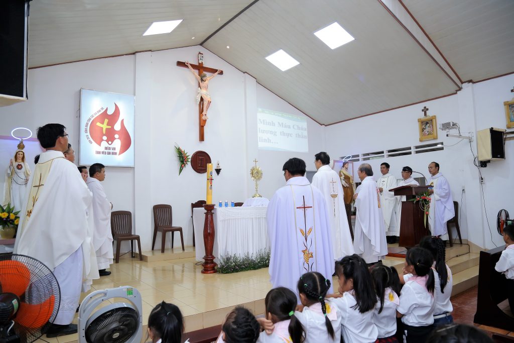 Sau phần hiệp lễ, Cha Phụ trách đặt Mình Thánh Chúa để cộng đoàn bước vào các giờ chầu Thánh Thể. Khởi đầu là giờ chầu của Giới Thiếu nhi và các anh chị Giáo Lý viên. Vào lúc 17g00, thánh lễ tạ ơn và trao ban Bí tích Thánh Thể lần đầu cho 9 em thiếu nhi trong Giáo họ đã khép lại ngày chầu Thánh Thể đầy sốt sắng với muôn vàn hồng ân của Chúa Giêsu Thánh Thể tuôn đổ trên GHBL Long Tân.