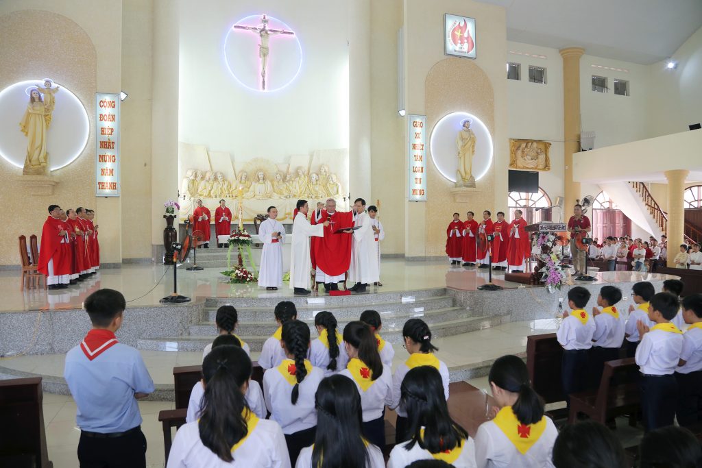Sau lời nguyện hiệp lễ, một vị đại diện giáo xứ bày tỏ lời tri ân sâu sắc tới Đức cha, quý cha, quý giáo lý viên và cộng đoàn. Trong phần huần từ, Đức cha cũng nhắc nhở các thụ nhân vừa được lãnh nhận hồng ân Thánh Linh trong ngày hôm nay: các em được thêm sức mạnh và ân thiêng, được tăng trưởng và hoàn tất ân sủng của Bí tích Rửa tội, thì phải sống gắn kết mật thiết với Hội Thánh và trở nên nhân chứng cho niềm vui Tin Mừng cứu độ giữa lòng thế giới hôm nay.