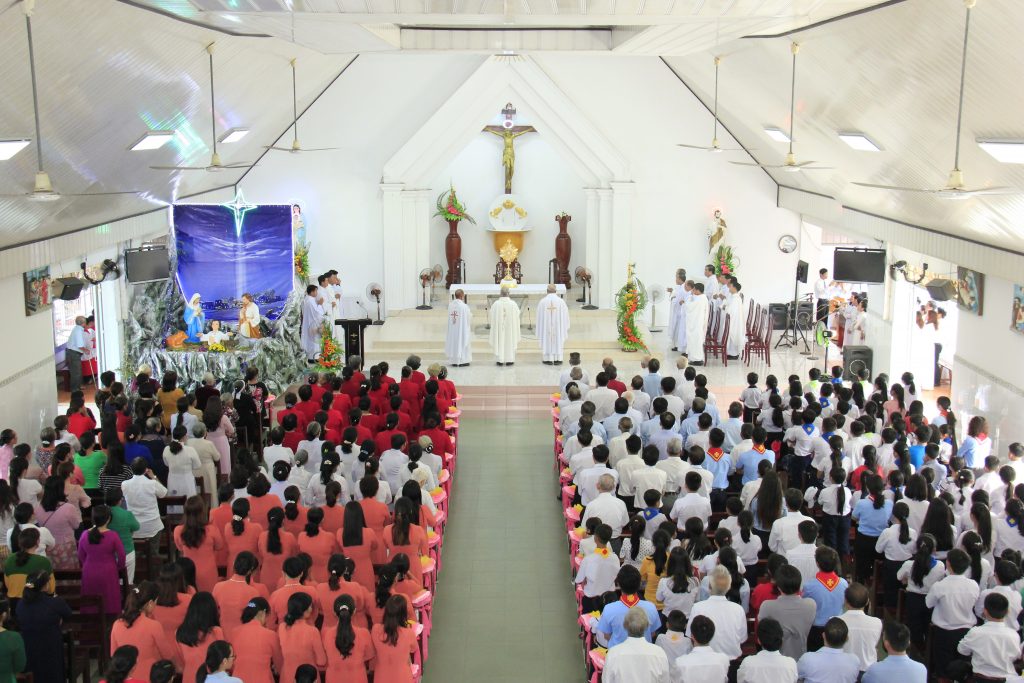 Ngay từ bên ngoài nhà thờ, hình ảnh hang đá và những trang trí đẹp mắt xung quanh khuôn viên đã gợi lên một niềm vui rộn ràng của những ngày Giáng Sinh Hồng Ân. Đúng 09g00, đoàn đồng tế tiến vào thánh đường. Thánh lễ do Cha Anphongsô Nguyễn Văn Thế- Quản hạt Xuyên Mộc chủ tế.