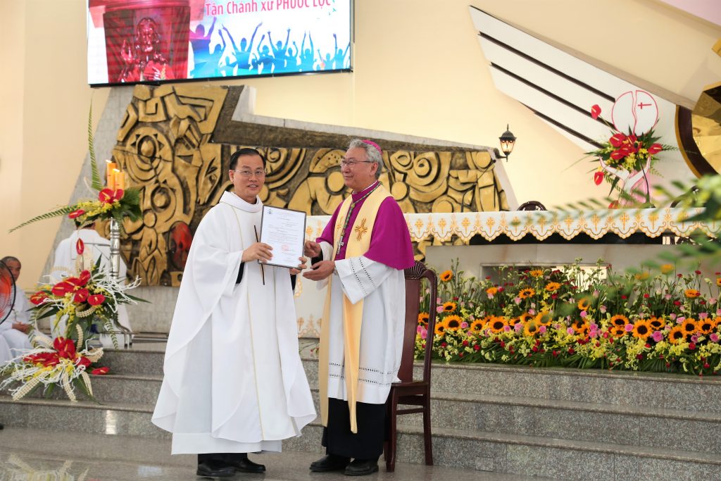 Mở đầu nghi thức nhận xứ, Cha Văn phòng TGMBR. công bố văn thư bổ nhiệm Cha Phêrô Trần Thanh Sơn – Nguyên Chánh xứ Ngọc Hà làm Chánh xứ Phước Lộc. Chính tay Đức cha Emmanuel trao văn thư cho Cha Phêrô. Tiếp đến, Đức cha trao Dây Các Phép và Sách Tin Mừng thể hiện quyền thánh hóa và huấn giáo cộng đoàn của người mục tử đối với đoàn dân Chúa.