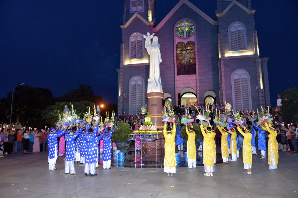 Trước khi cử hành giờ dâng hoa, cộng đoàn đã rước nến và kiệu hoa từ trong nhà thờ ra tượng đài Mẹ Maria dưới sân nhà thờ. Cha phó xứ Giuse Nguyễn Thanh Hùng chủ sự, Cha Chánh xứ – Đa minh Nguyễn Đức Quỳnh hướng dẫn, cộng đoàn giáo xứ tay cầm nến sáng, những đóa hoa tươi, cùng với các em trong Ca đoàn Giới trẻ dâng lời ngợi ca tôn vinh Mẹ trên trời, tiến dâng Mẹ những đóa hoa tươi thắm cùng những bó hoa thiêng liêng được đan kết bằng những hi sinh, hãm mình, bác ái… Kính xin Mẹ giữ gìn Hội Thánh và thế giới luôn được bình an. Xin Mẹ dẫn đắt đoàn con, để qua chính mẫu gương của Mẹ, Thánh ý Chúa được thực hiện trên mỗi cuộc đời và mỗi gia đình con cái Mẹ, đặc biệt các gia đình đang gặp khó khăn…