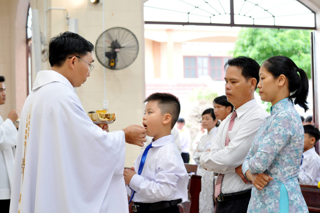 Trong phần hiệp lễ, lần lượt 164 thiếu nhi được long trọng rước Chúa Giêsu Thánh Thể dưới hai hình Bánh và Rượu.