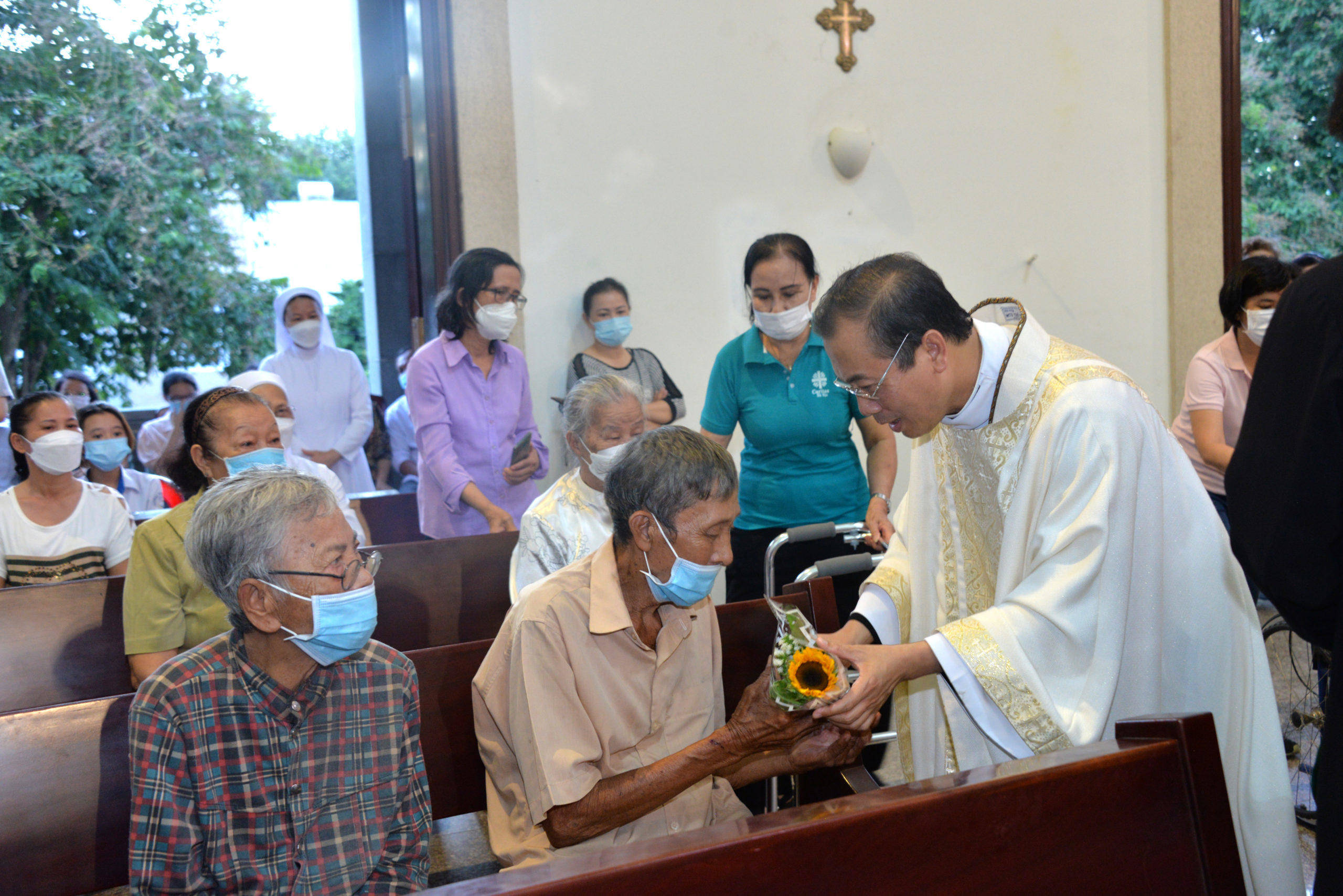 Sau phần Hiệp lễ, quý Cha thay mặt cộng đoàn tặng hoa chúc mừng các cụ và sau thánh lễ, Quý chức đai diện Ban Hành giáo và Hội viên Caritas giáo xứ đã thay mặt cộng đoàn, trao tặng mỗi cụ một phần quà nhỏ, chia sẻ niềm vui với các cụ trong Ngày thế giới ông bà và người cao tuổi lần hai.