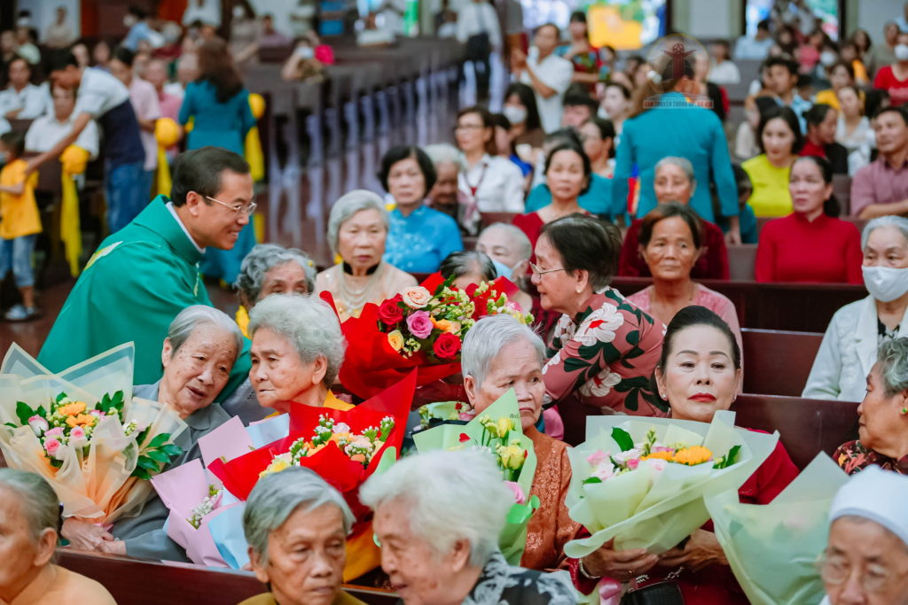 Kết thúc thánh lễ, Cha Chánh xứ thay lời cộng đoàn chúc mừng quý sơ cao tuổi và quý cụ. Tiếp đó, Cha Chánh xứ, Cha Phó xứ và quý chức tặng hoa, trao quà chúc mừng các cụ.