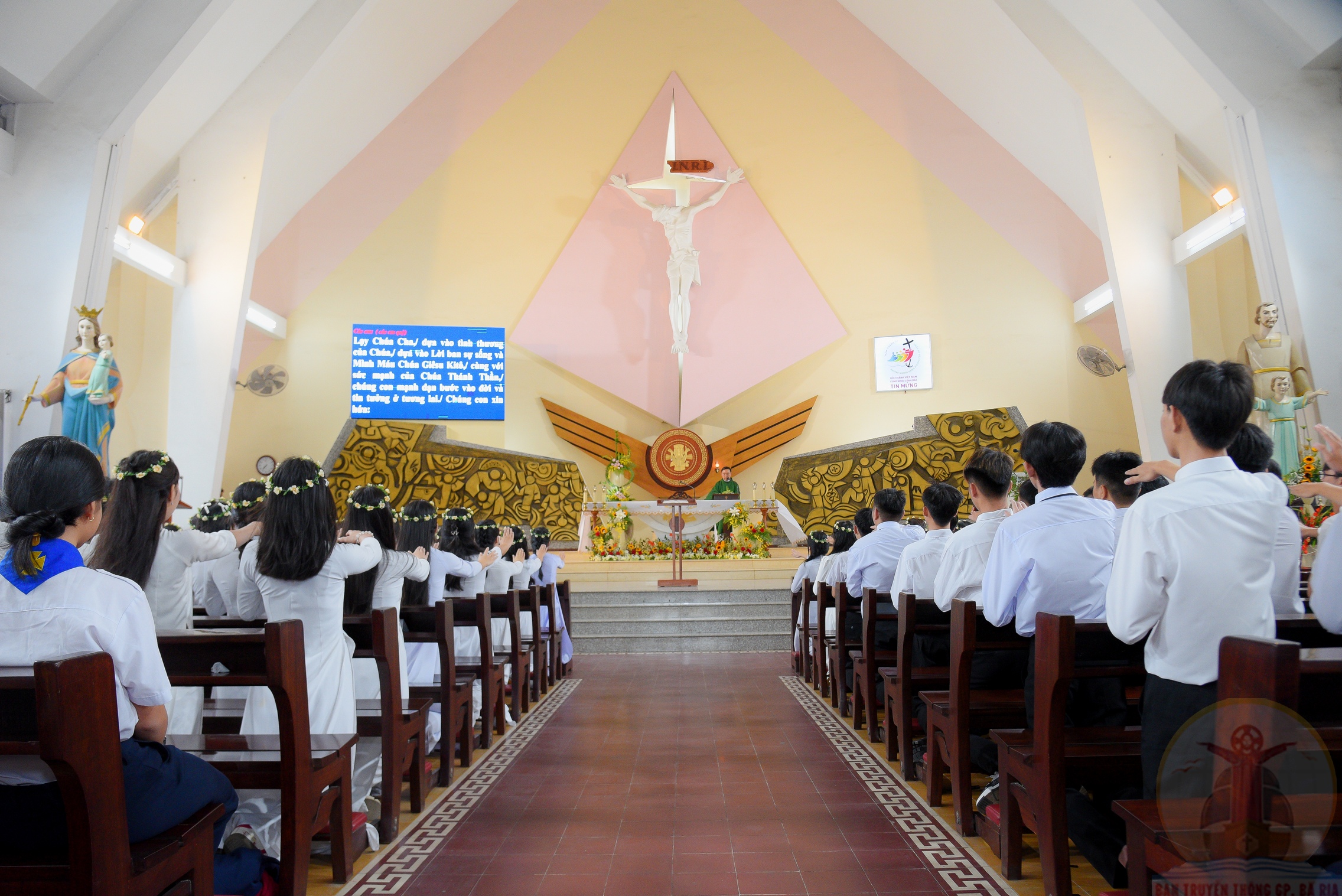 Khởi đầu Thánh lễ, Cha Chánh xứ mời gọi cộng đoàn hiện diện hãy cầu xin Chúa soi sáng cho các em, để giúp các em không ngừng vươn lên, hoàn thiện chính mình và biết đem lời Chúa đến với tất cả mọi người.