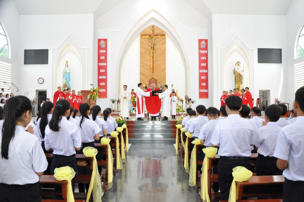 Đúng 9g00, đoàn đồng tế cùng cùng các em tiến vào thánh đường hiệp dâng thánh lễ do Đức Cha Emmanuel chủ tế. Cùng đồng tế có Cha Anphongsô Nguyễn Văn Thế – Quản hạt Xuyên Mộc và quý Cha. Đông đảo cộng đoàn đã hiện diện hiệp dâng thánh lễ cầu xin Chúa Thánh Thần tuôn đổ hồng ân xuống trên các thụ nhân sẽ lãnh nhận Bí Tích Thêm sức hôm nay.