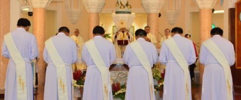– Trong lời huấn dụ phần nói với các tiến chức phó tế: “Các con thân mến, các con sắp lên chức Phó Tế. Chúa đã nêu gương để các con làm theo như Người đã làm. Vậy, Phó Tế là những thừa tác viên của Đức Giêsu Kitô, Đấng ở giữa các môn đệ như người phục vụ, các con hết lòng làm theo ý Thiên Chúa trong lòng mến, các con hân hoan phục vụ Chúa thế nào thì hãy hân hoan phục vụ người ta thế ấy…”