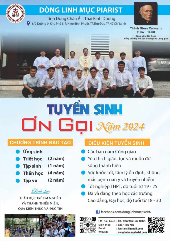 Để tiếp tục sứ vụ rao giảng Lời Chúa qua việc giáo dục trẻ em và thanh thiêu niên trong Kiến Thức và Đức Tin, Ban Tuyển Sinh Ơn Gọi Dòng Linh Mục Piarist, Tỉnh Dòng Châu Á – Thái Bình Dương xin trân trọng gửi đến quý Cha, quý Tu sĩ nam nữ, quý Phụ huynh và các bạn trẻ thông báo về việc tuyển sinh ơn gọi 2024.