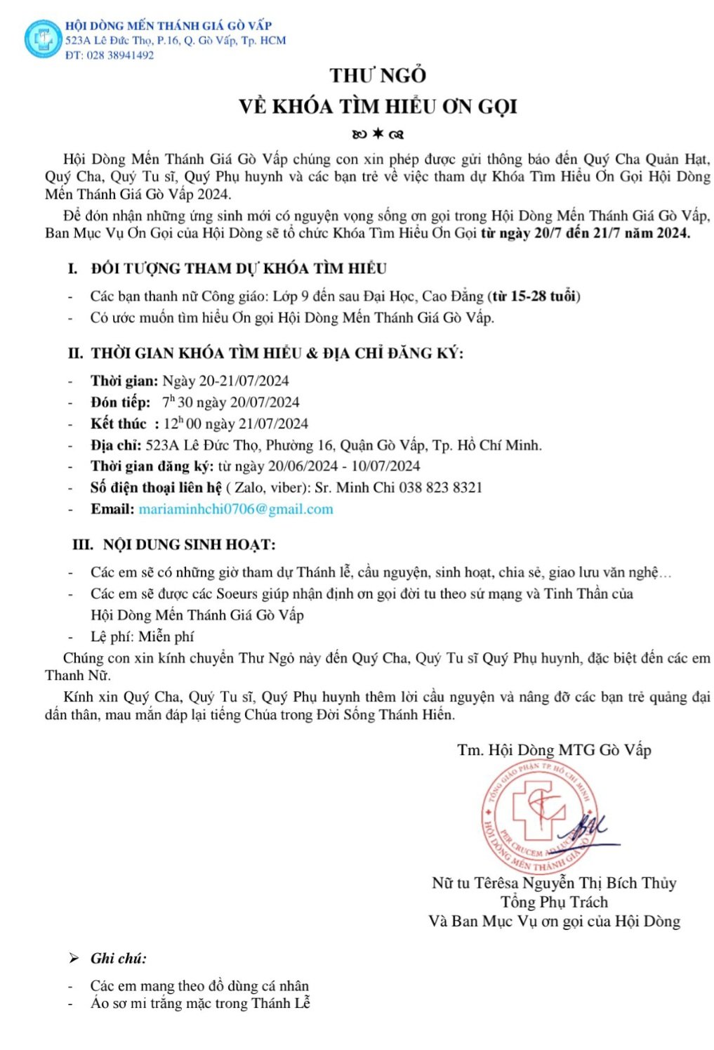 Thư ngỏ về khóa tìm hiểu Ơn Gọi năm 2024