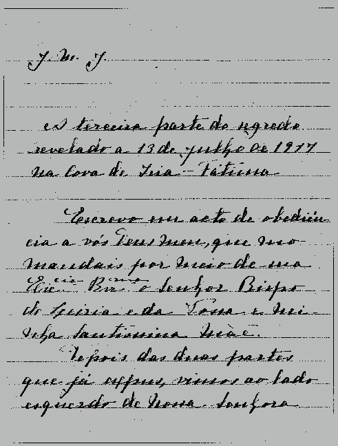 Phần thứ ba của “bí mật” được viết ra theo “lệnh của Ðức Giám-mục địa phận Leiria và của Mẹ Rất Thánh của chúng ta.” vào ngày 3 tháng Giêng, 1944.
