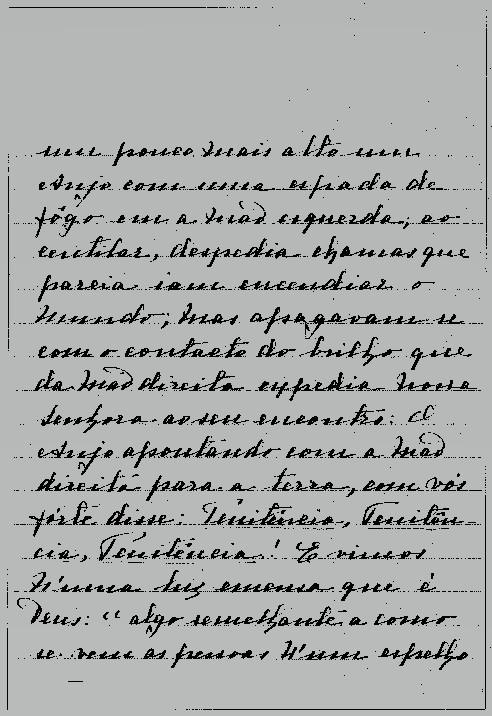 Sau hai phần mà con đã giải thích rồi, ở phía bên trái Ðức Mẹ và hơi cao lên một chút, chúng con thấy một Thiên-thần với thanh gươm bừng cháy trong tay trái; sáng rực lên, nó như tung ra những ngọn lửa giống như là chúng sẽ đốt cháy thế giới; nhưng chúng tắt ngấm đi khi chạm vào ánh vinh quang mà Ðức Mẹ dùng tay phải chiếu sáng về phía thiên thần từ tay phải của Mẹ: chỉ tay phải xuống trái đất, Thiên thần hô lớn lên rằng: ‘Ðền tội, Ðền tội, Ðền tội!’ Và chúng con thấy trong luồng sáng chan hòa chính là Thiên Chúa:’chuyện giống như người ta thấy mình trong gương thế nào khi họ đi ngang qua nó’ thì cũng giống như vậy ‘một vị Giám-mục mặc màu trắng’ mà chúng con có cảm tưởng đó là Ðức Thánh Cha’. Quí vị Giám-mục khác, quí Linh-mục, quí Tu-sĩ nam nữ đang bước lên một ngọn núi thẳng đứng mà trên đỉnh núi có một cây Thánh giá lớn làm bằng thân cây còn sần sùi như loại gỗ bấc còn cả vỏ; trước khi đến tới nơi Ðức Thánh Cha đã đi ngang qua một thành phố lớn mà một nửa đã bị tiêu hủy và một nửa thì đang rung rinh với bước chân ngập ngừng, ảnh hưởng của đớn đau và phiền muộn, Ngài đã cầu nguyện cho những linh hồn của những tử thi Ngài gặp dọc đường; khi đã tới đỉnh núi, khi đang quì dưới chân cây Thánh giá lớn thì Ngài bị giết bởi một nhóm binh sĩ bắn những viên đạn và những mũi tên vào Ngài, và cũng bằng một cách như thế, đã chết ở đó người nọ nối tiếp người kia là các vị Giám-mục khác, các Linh-mục, các Tu-sĩ nam nữ, và nhiều giáo dân khác của nhiều tầng lớp và địa vị khác nhau. Bên dưới hai cánh tay Thánh-giá có hai Thiên-thần, mỗi vị cầm trong tay một bình đựng nước thánh bằng pha lê, các ngài thu máu các vị Tử đạo lại vào các bình này và rảy trên các linh hồn đang tìm đường đến với Thiên Chúa.