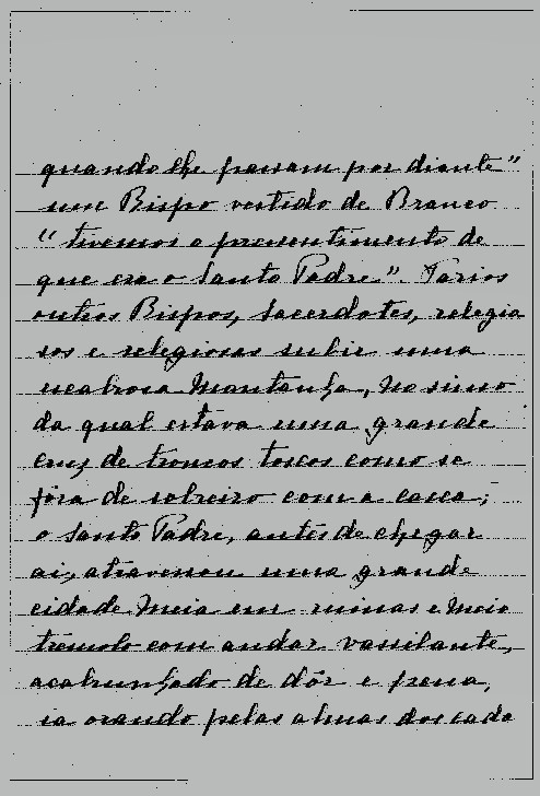 Khi được hỏi: ” Có phải nhân vật chính trong thị kiến là Ðức Giáo-hoàng không?”, Sơ Lucia đã lập tức trả lời đúng như vậy. Sơ nhớ lại là ba em đã rất buồn vì Ðức Giáo-hoàng phải đau đớn, và Gia-xinh-ta cứ nói hoài:” Coitadinho do Santo Padre, tenho muita pena dos pecadores!” (” Tội nghiệp Ðức Thánh Cha, em rất buồn vì những tội nhân!”). Sơ Lucia lại nói tiếp: “Chúng con đã không biết tên Ðức Giáo-hoàng; Ðức Mẹ không nói cho chúng con biết tên Ðức Giáo-hoàng; chúng con không biết có phải là Ðức Bê-nê-đi-tô XV hay Ðức Pi-ô XII hay Ðức Phao-lô VI hay Ðức Gio-an Phao-lô II hay không; nhưng đúng là một vị Giáo-hoàng đang đau đớn và làm cho chúng con cũng đau đớn nữa”