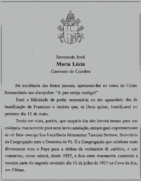 Bởi vì hôm đó sẽ chỉ đủ thời giờ để chào hỏi thôi chứ không đủ giờ để đàm thoại, nên Cha nhờ Ðức Tổng Giám-mục Tarcisio Bertone, Thư-ký Thánh-bộ về Tín-lý Ðức-tin đến nói chuyện với con. Ðây là Thánh-bộ làm việc gần gũi nhất với Ðức Giáo-hoàng trong việc bảo vệ đức tin Công-giáo chân truyền, và từ năm 1957, như con biết, Thánh-bộ đã lưu giữ bức thư viết tay của con chứa đựng phần thứ ba của “bí mật” được mạc khải ngày 13 tháng Bảy, 1917 tại Cova da Irie, Fatima.