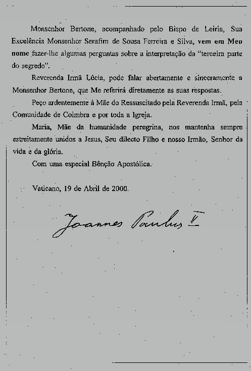 Ðức Tổng Giám-mục Bertone cùng với Ðức Giám-mục địa phận Leiria, tức là Ðức Cha Serafim de Sousa Ferreira e Silva, sẽ đại diện Cha đến để hỏi con một số câu hỏi về việc giải thích “phần thứ ba của bí mật”.
