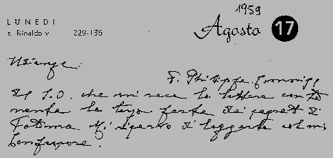 Theo hồ sơ của Văn-khố mật thì vị Ðại-diện của Thánh-bộ, cha Phê-rô Phao-lô Phi-líp-phê dòng Ða-minh, với sự đồng ý của Ðức Hồng-y Alfredo Ottaviani, đã mang phong bì chứa phần thứ ba của “bí mật Fatima” đến cho Ðức Giáo-hoàng Gio-an XXIII ngày 17 tháng Tám, 1959. “Sau một chút lưỡng lự” Ðức Thánh Cha đã nói: “Chúng ta sẽ đợi. Cha sẽ cầu nguyện. Cha sẽ cho con hay điều Cha quyết định”. (1)