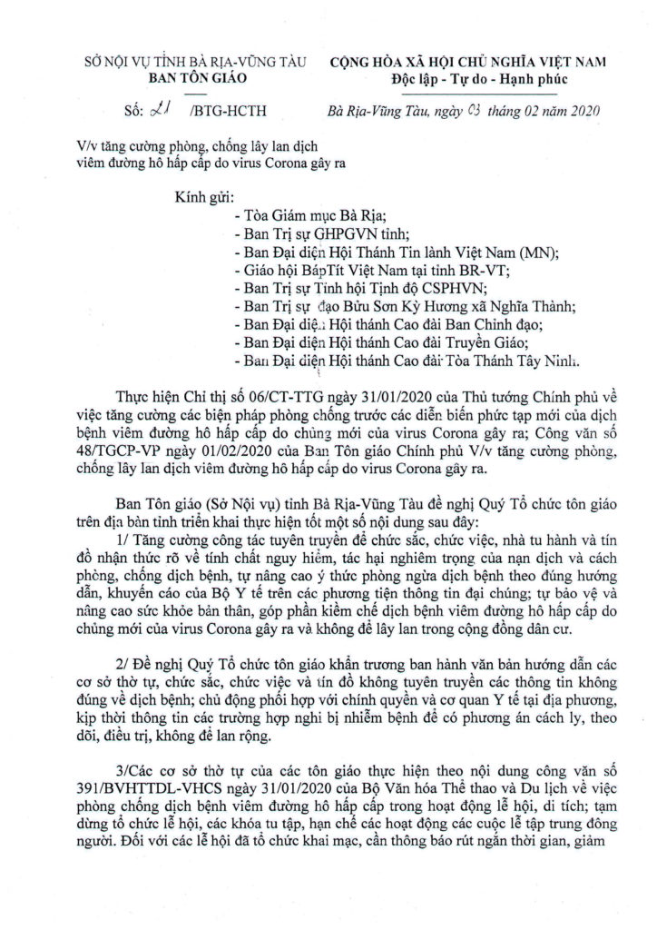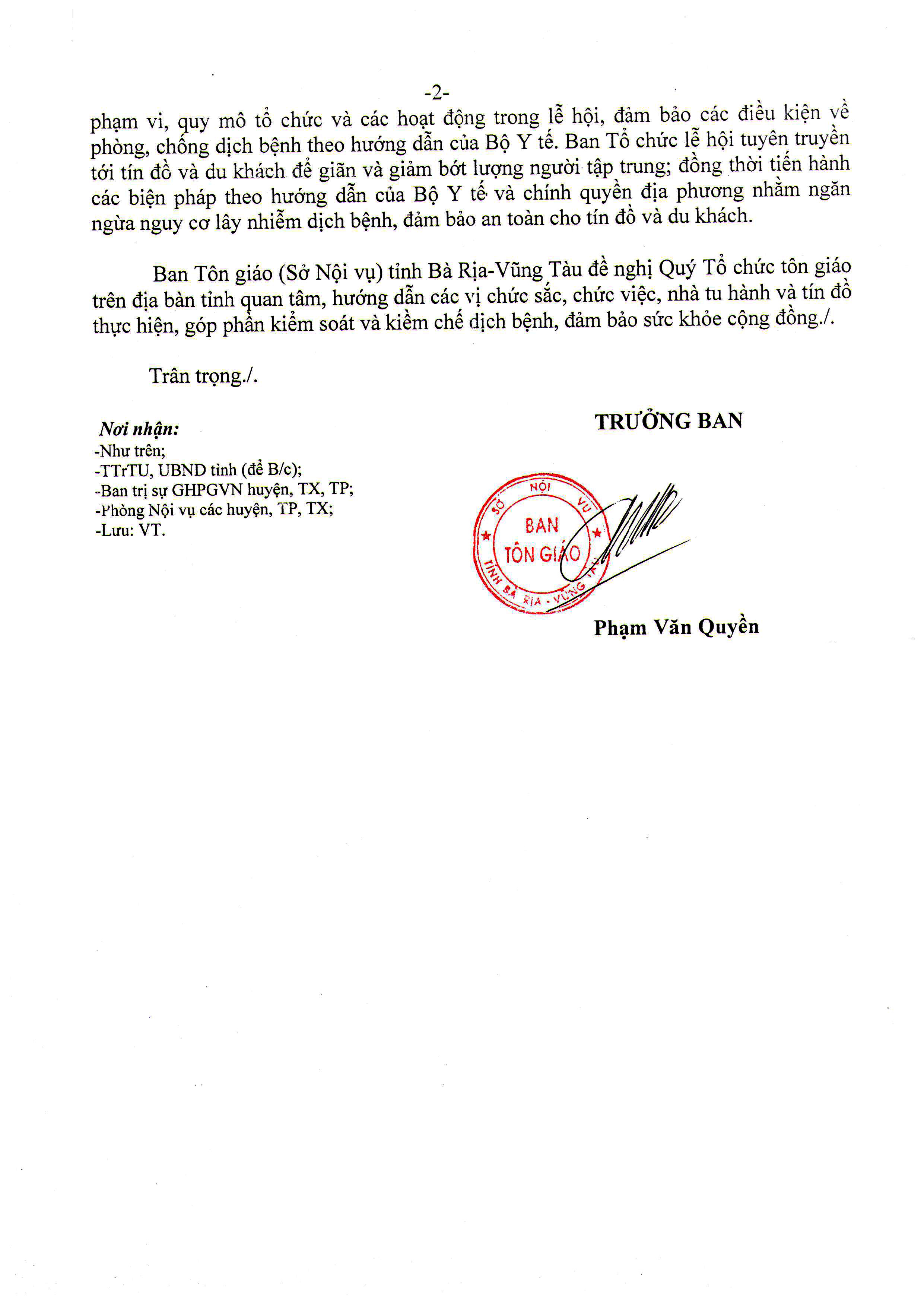 của Ban Tôn Giáo Tỉnh Bà Rịa Vũng Tàu gởi các cơ sở tôn giáo