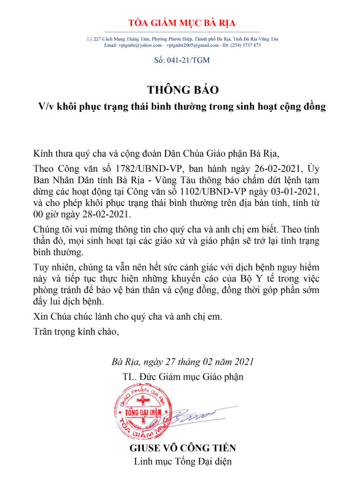Chúng tôi vui mừng thông tin cho quý cha và anh chị em biết. Theo tinh thần đó, mọi sinh hoạt tại các giáo xứ và giáo phận sẽ trở lại tình trạng bình thường.