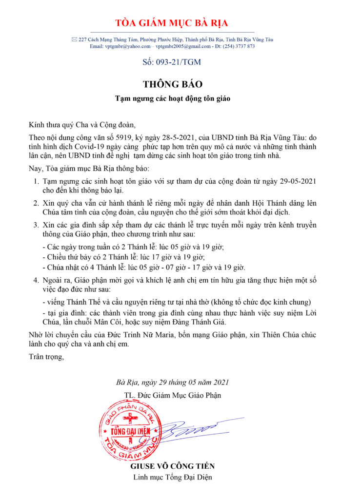 Theo nội dung công văn số 5919, ký ngày 28-5-2021, của UBND tỉnh Bà Rịa Vũng Tàu: do tình hình dịch Covid-19 ngày càng phức tạp hơn trên quy mô cả nước và những tỉnh thành lân cận, nên UBND tỉnh đề nghị tạm dừng các sinh hoạt tôn giáo trong tỉnh nhà.