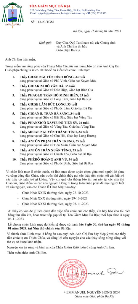 Ai thấy có vấn đề gì liên quan đến việc tiến chức của các thầy, xin hãy báo cho tôi biết bằng thư dán kín, hoặc trực tiếp gặp tôi tại Tòa Giám Mục Bà Rịa; thời hạn chót là ngày 06-11-2023.