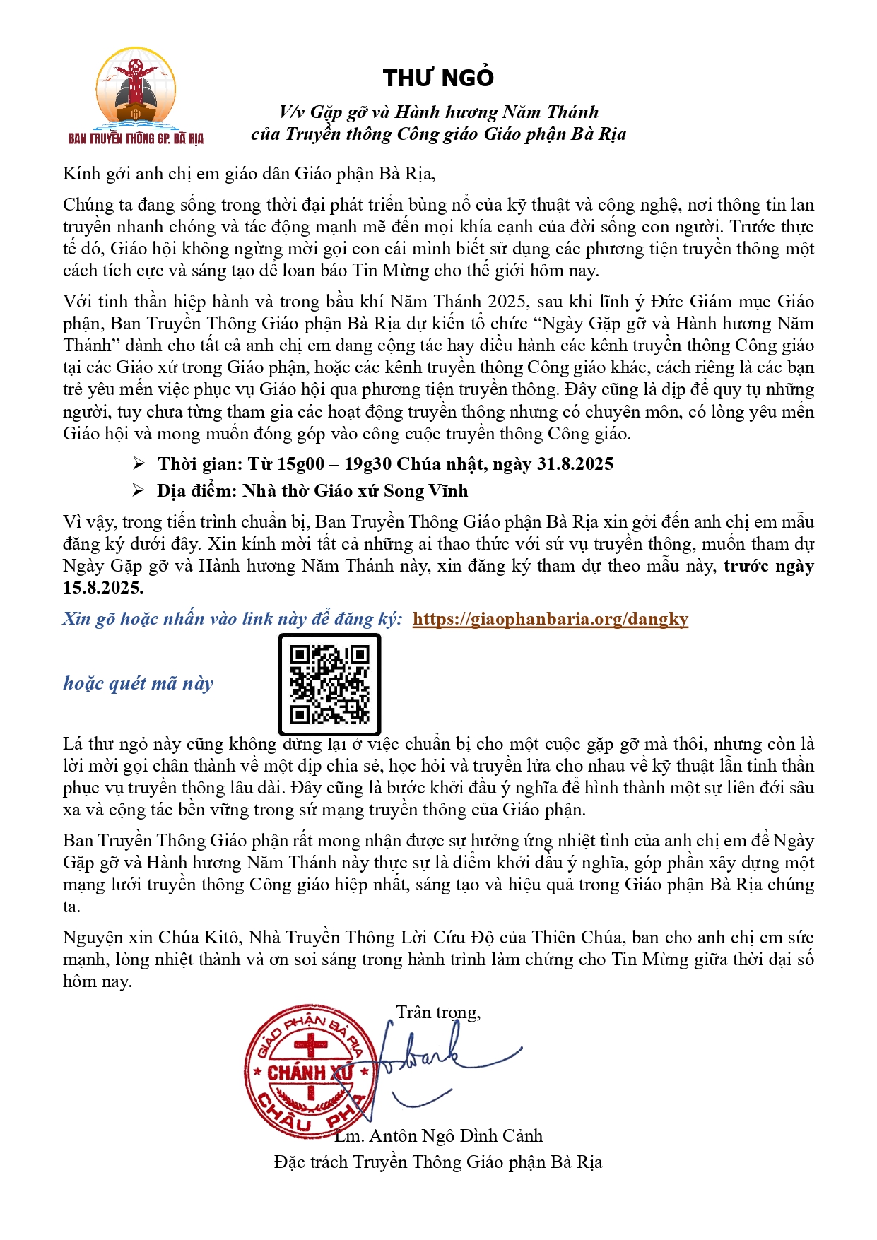 Ban Truyền Thông Giáo phận rất mong nhận được sự hưởng ứng nhiệt tình của anh chị em để Ngày Gặp gỡ và Hành hương Năm Thánh này thực sự là điểm khởi đầu ý nghĩa, góp phần xây dựng một mạng lưới truyền thông Công giáo hiệp nhất, sáng tạo và hiệu quả trong Giáo phận Bà Rịa chúng ta.