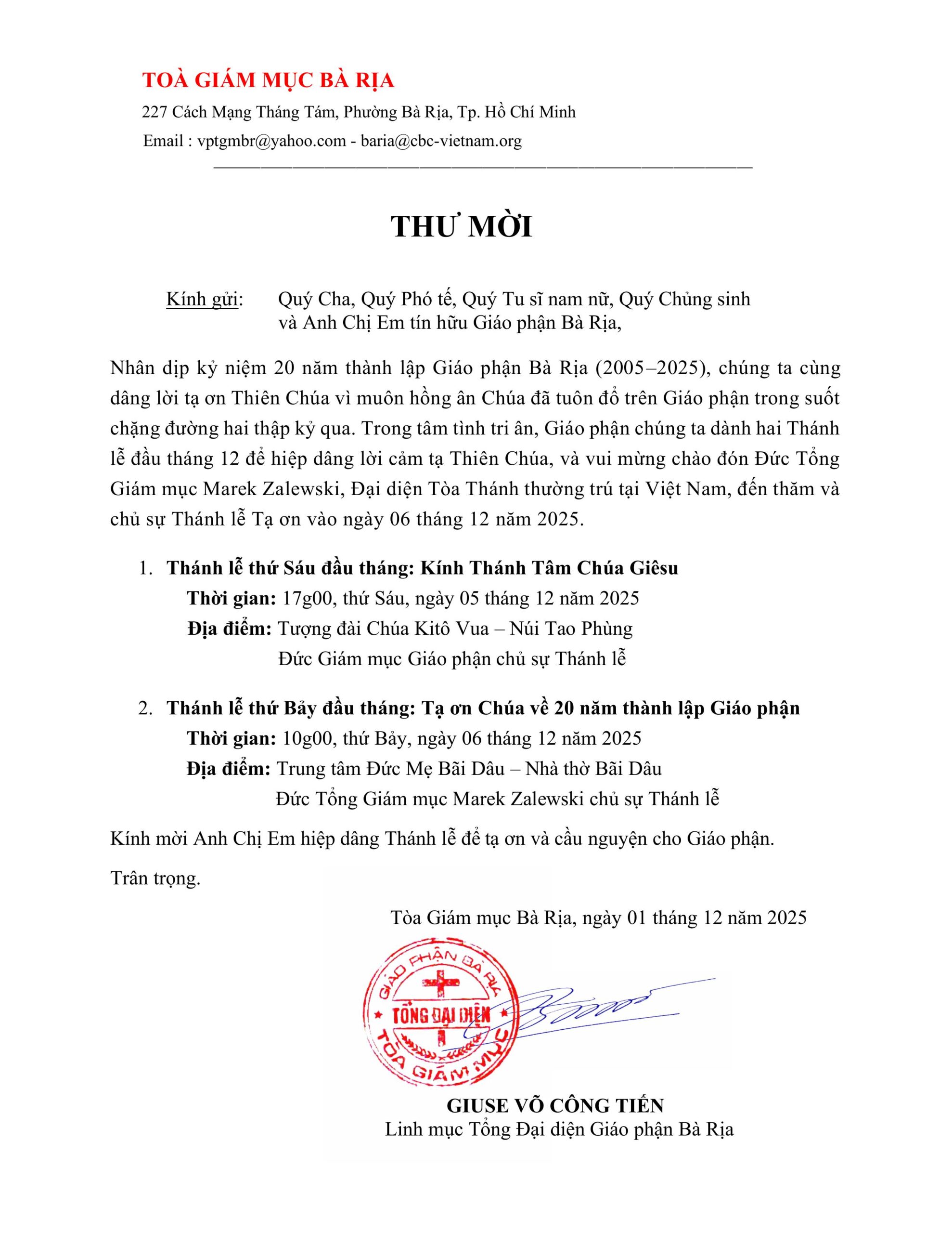 TÒA GIÁM MỤC BÀ RỊA: THƯ MỜI THAM DỰ ĐẠI LỄ GIÁO PHẬN