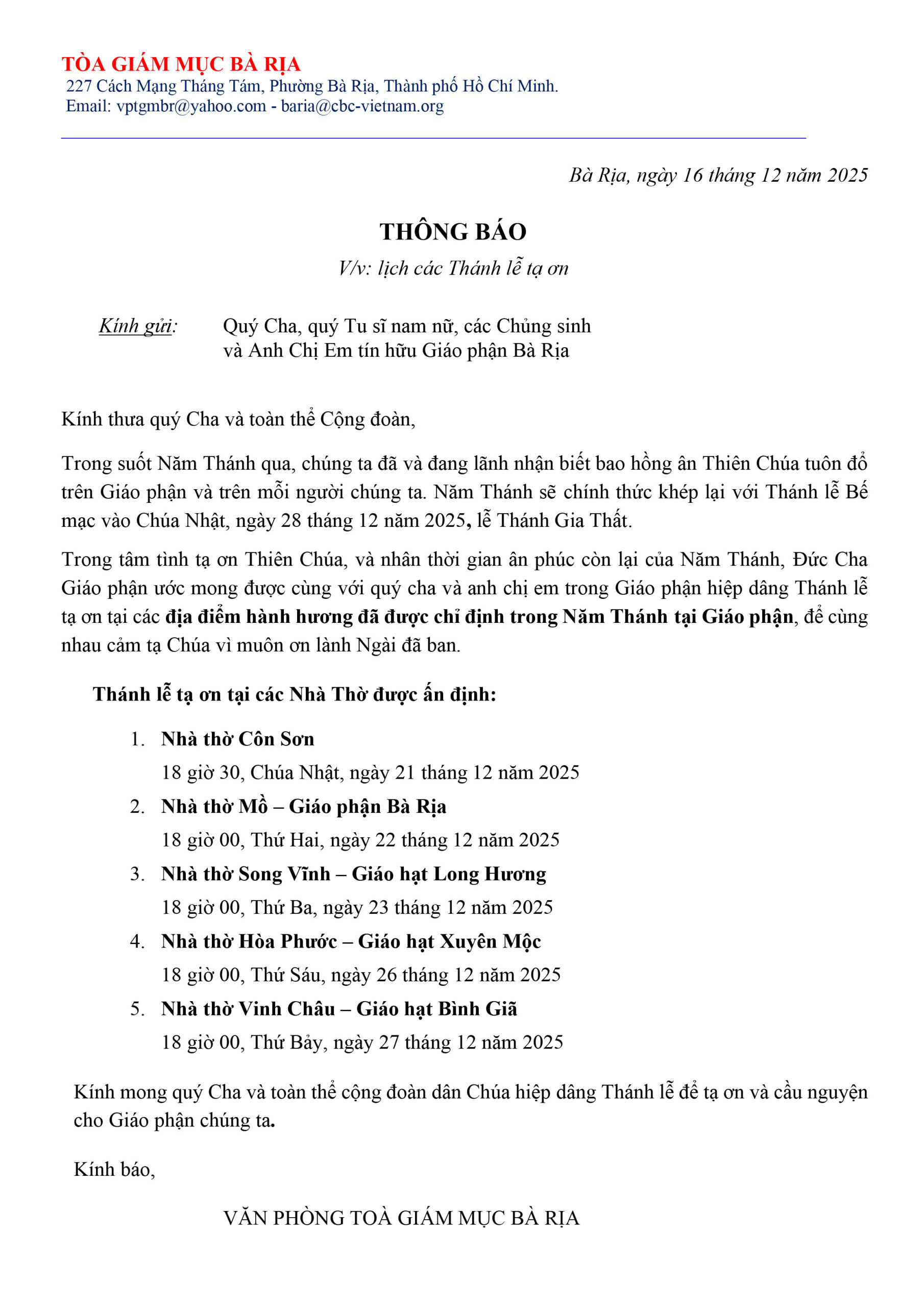 Trong tâm tình tạ ơn Thiên Chúa, và nhân thời gian ân phúc còn lại của Năm Thánh, Đức Cha Giáo phận ước mong được cùng với quý cha và anh chị em trong Giáo phận hiệp dâng Thánh lễ tạ ơn tại các địa điểm hành hương đã được chỉ định trong Năm Thánh tại Giáo phận, để cùng nhau cảm tạ Chúa vì muôn ơn lành Ngài đã ban.