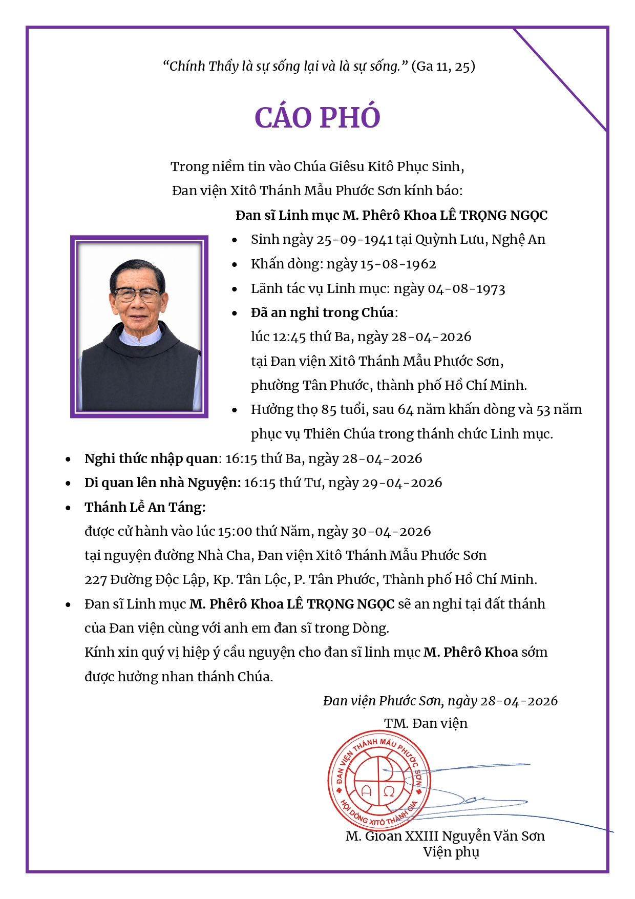 CÁO PHÓ: Đan sĩ Linh mục M. Phêrô Khoa LÊ TRỌNG NGỌC