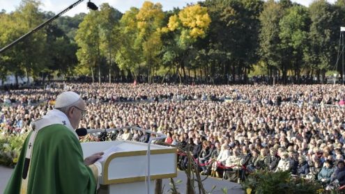 Sáng Chúa nhật 23.9.2018, ngày thứ hai trong chuyến viếng thăm Lituani, lúc 10g sáng, ĐTC Phanxicô đã dâng Thánh lễ trước sự hiện diện của khoảng 100 ngàn tín hữu đến từ các miền của Lituani. Đồng tế với ngài, ngoài các giám mục thuộc 7 giáo phận ở Lituani, còn có nhiều giám mục từ các nước lân cận, đặc biệt có Đức Tổng Giám mục trưởng Sviatoslav Shevchuk, thủ lãnh của 4 triệu 500 ngàn tín hữu Công giáo Ucraina nghi lễ đông phương. Hơn 500 linh mục đồng tế trong phẩm phục màu xanh lá cây ngồi ở khu vực trước lễ đài đơn sơ. Bà tổng thống Dalia Grybaauskaite và một số quan chức trong chính phủ cũng hiện diện. Phần thánh ca do một ca đoàn hùng hậu gần 600 ca viên trong đồng phục màu trắng đảm trách.